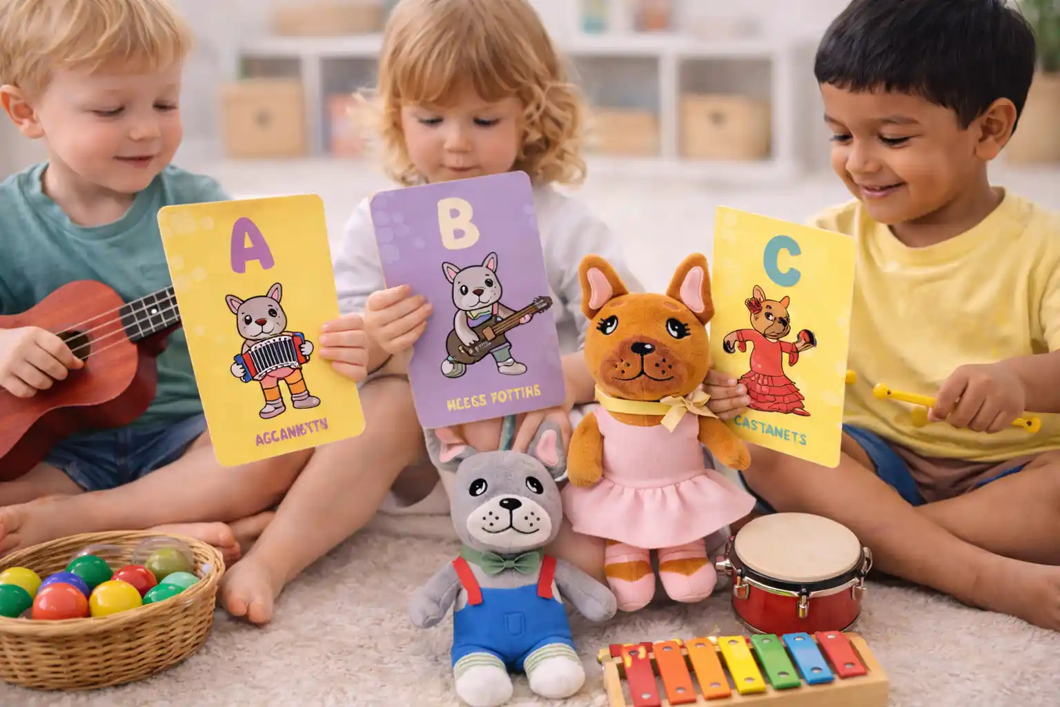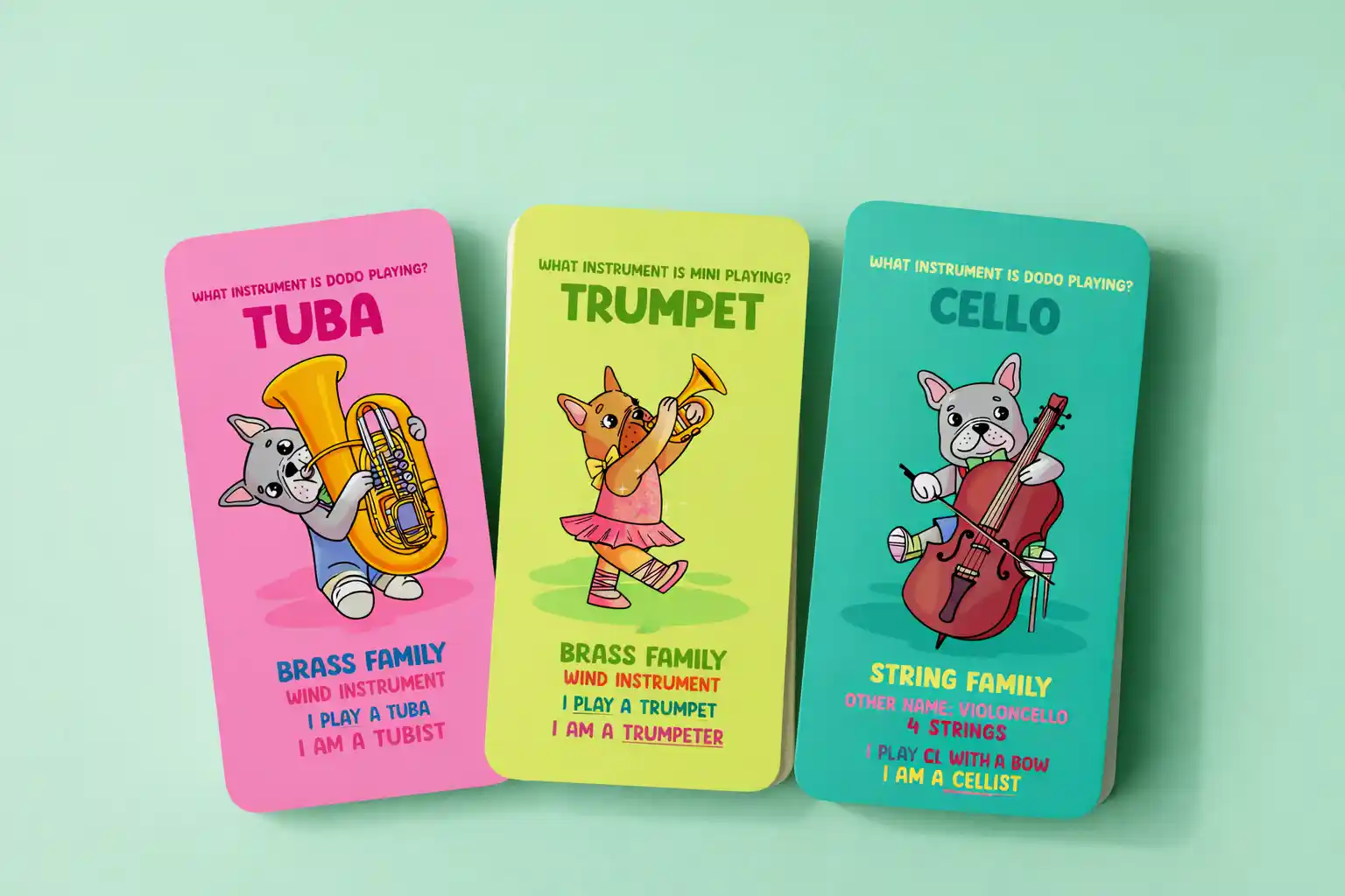 The FlashCards are an invaluable tool for both parents and teachers, allowing them to teach music fundamentals effectively to toddlers and preschoolers. When used together with the Instrument Explorers with Mimi and Dodo™ Workbook, they create a structured yet playful introduction to the world of music.